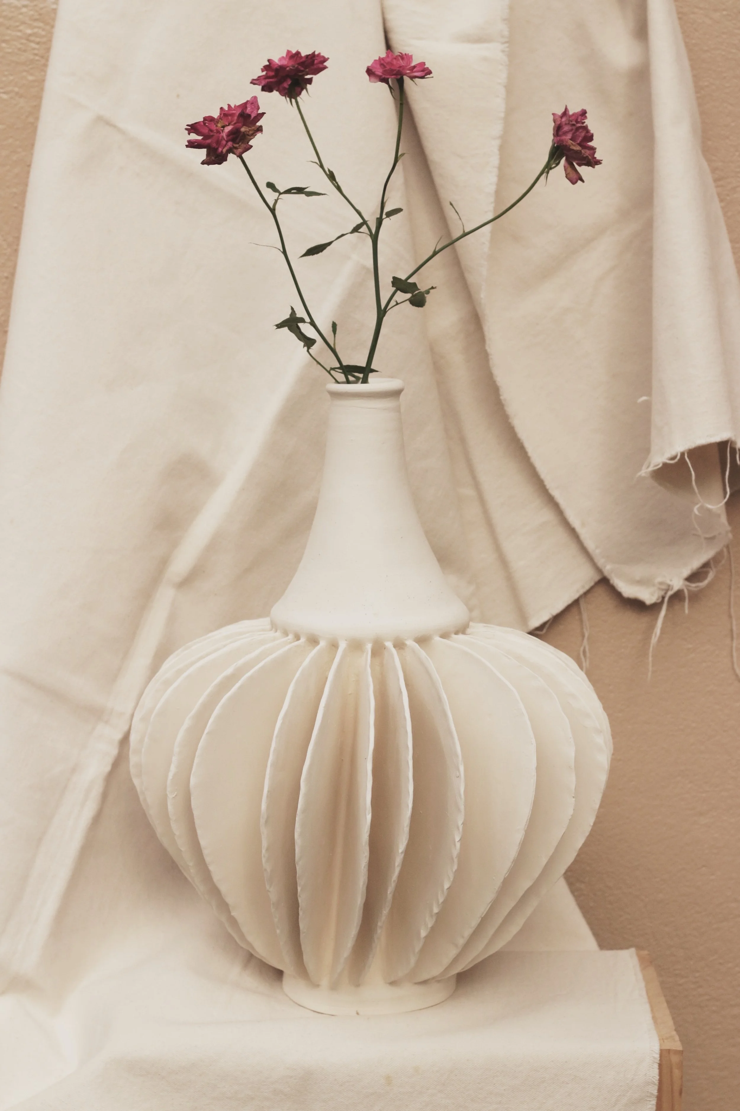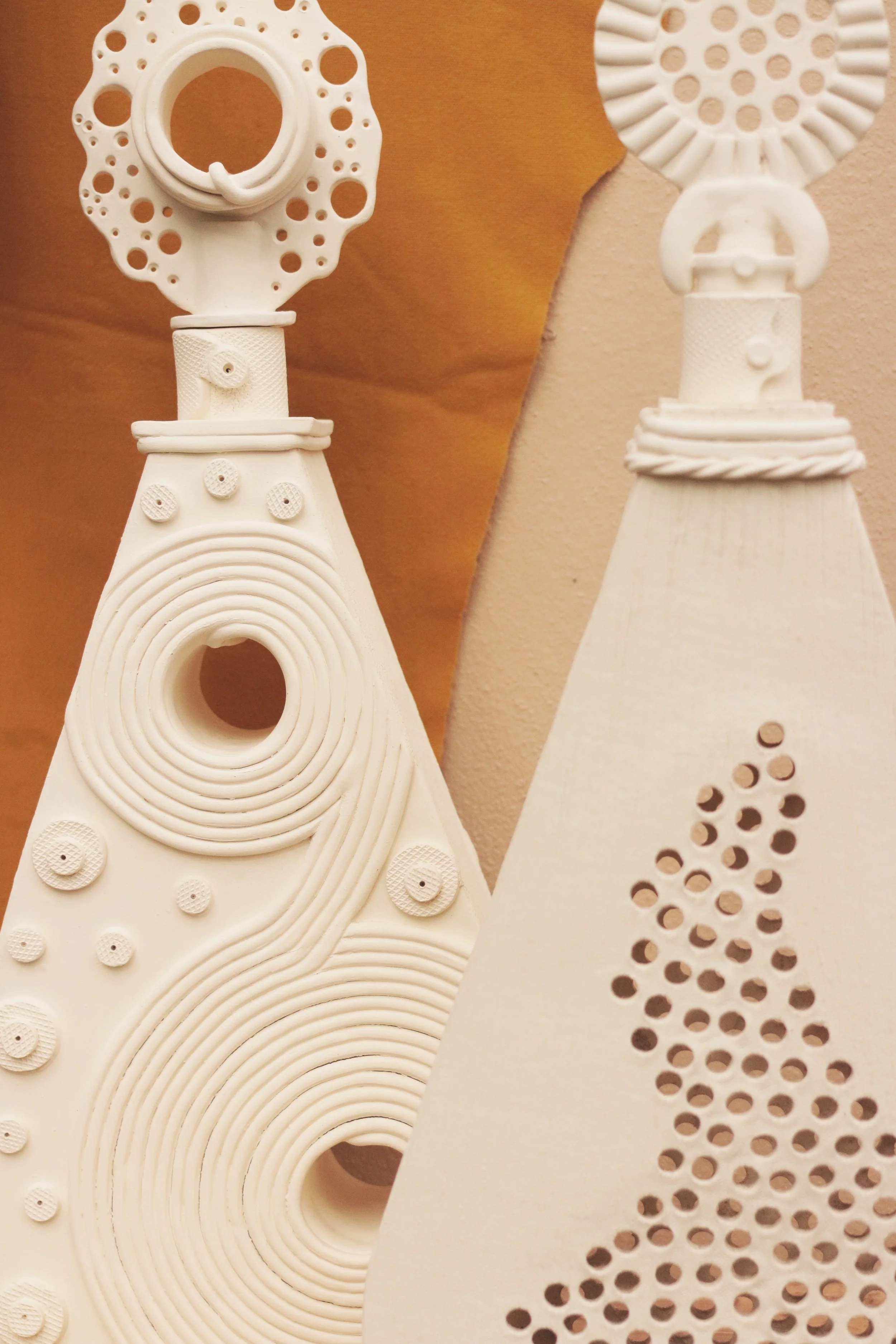 Botellas escultóricas funcionales. Debido a su construcción, cada forma es única y no se puede reproducir. Fue diseñado utilizando técnicas tradicionales de construcción manual. Acabado esmaltado mate en el exterior con un cristal transparente en el interior.